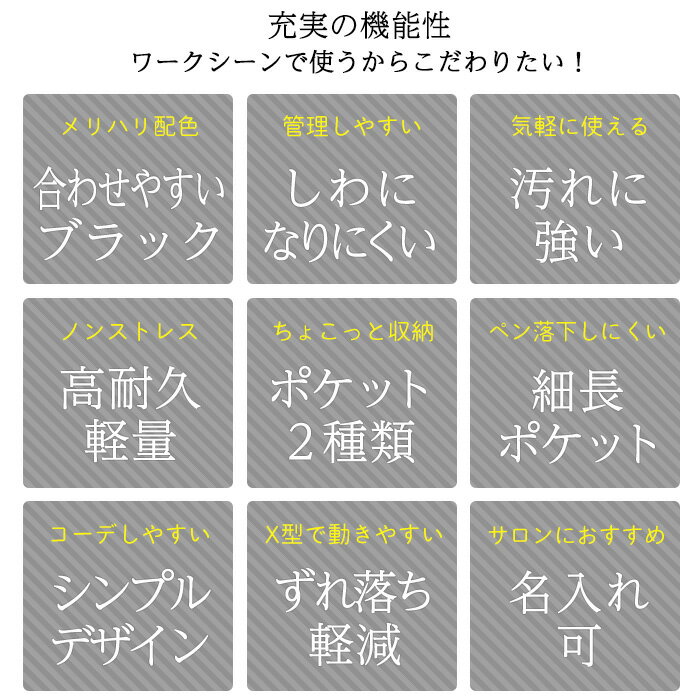 商品名リボンエプロンロング素材ポリエステル100%サイズ身丈:約80cm 身巾:約100cmカラーブラック原産国中国おすすめポイント〇しわになりにくい!汚れにくい!丈夫なポリエステル100%のツイル素材のエプロンです! 〇胸元にペンや櫛や筆などをさせるポケットと両脇のリボンポケットはとっても便利 〇両サイドにスリットが入っているので、動きやすく、機能性も考えました。