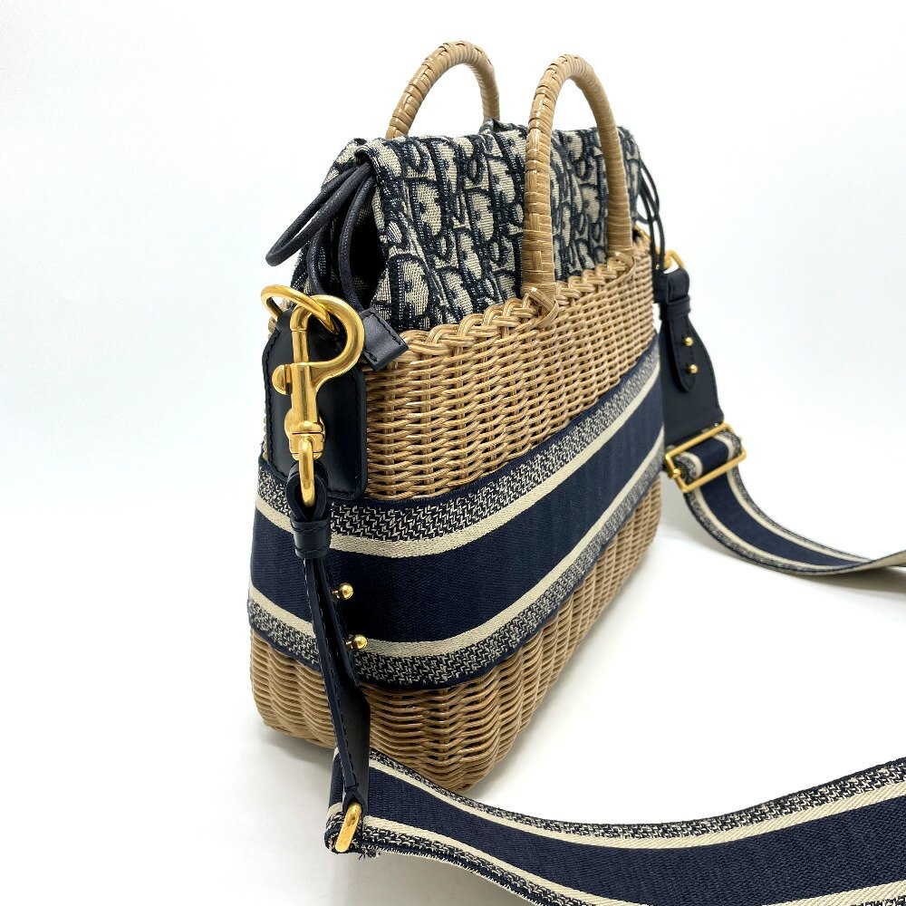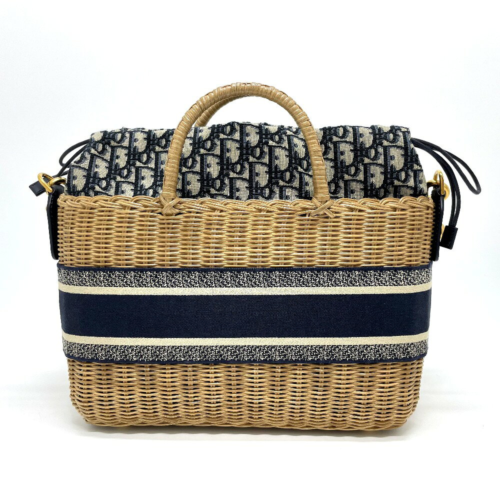 Dior ディオール オブリーク ウィッカー ジャカード かごバッグ 2WAY バスケットバッグ ハンドバッグ レザー/キャンバス/ストロー レディース ベージュ×ネイビー 新品同様 【中古】