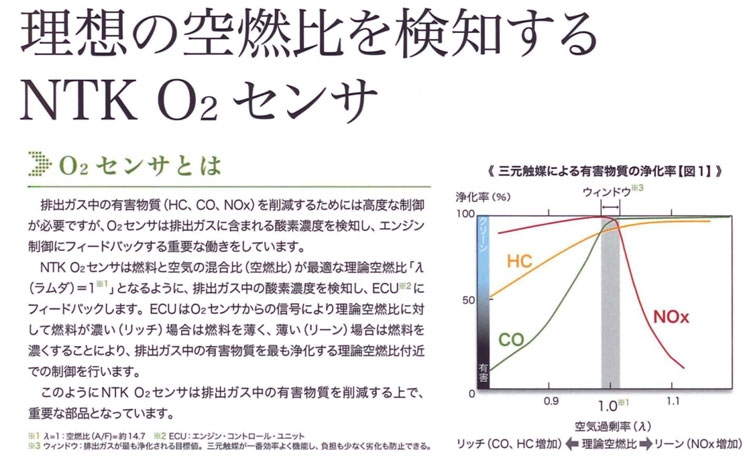NTK O2センサは燃料と空気の混合比(空燃比)が最適な理論空燃比「λ(ラムダ)=1」となるよう、 排出ガス中の酸素濃度を検知し、ECUにフィードバックします。