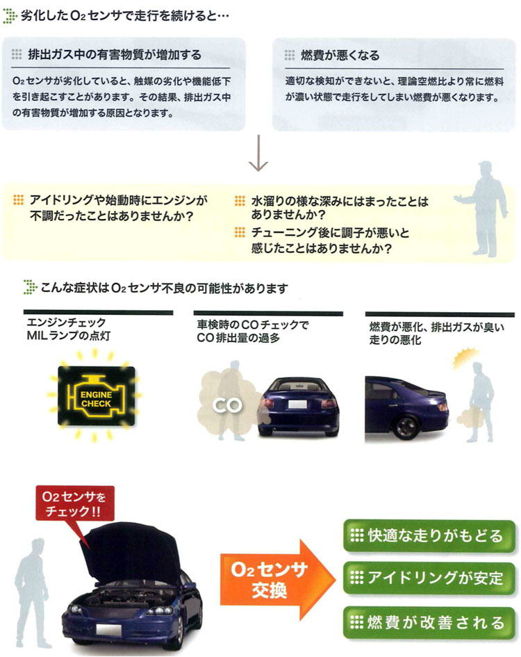 NTK(日本特殊陶業) O2センサー 理想の空燃比を検知するNTK O2センサ 排出ガス中の有害物質(HC、CO、NOx)を削減するためには高度な制御が必要ですが、 O2センサは排出ガスに含まれる酸素濃度を検知し、エンジン・コントロール・ユニットにフィードバックする重要な働きをしています。