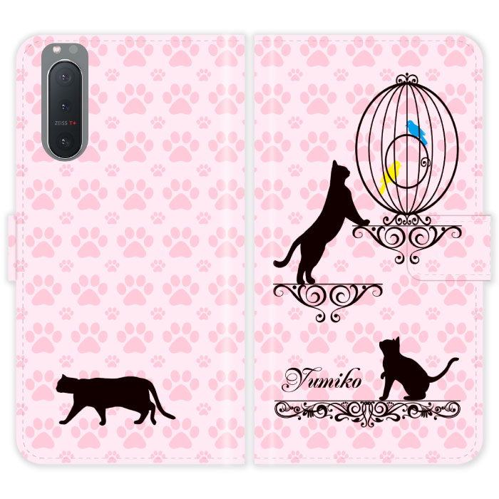 Xperia 5 II SO-52A SOG02 A002SO SO52A Xperia5II 手帳型 猫柄 名入れ 名前入り ケース カバー 猫と鳥かご かわいい エクスペリア スマートフォンケース