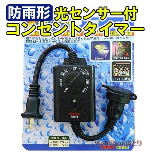 こんな場所にオススメ . ※メール便発送不可 断然お買得!光センサー付きタイマーコンセントCDS24を⇒2個ご購入希望の方はコチラから 一緒に買っても送料同じ!その他のオススメ品 防雨3連コード コンセントが少ない 屋外の電源確保に! 約20cm延長補助コード 差し込みにくい所や狭いコンセントの チョイ足し延長コード 他の防雨延長コード 屋外で遠い場所の電源に 【送料無料の注意点】※お届け先が沖縄・離島の場合は追加料金が発生します。