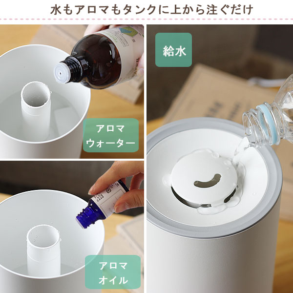 外して洗える給水タンクで、お手入れもラクラクです! タンクの水にアロマオイル、アロマウォーターをそのまま垂らして使えちゃうのも便利ですね。