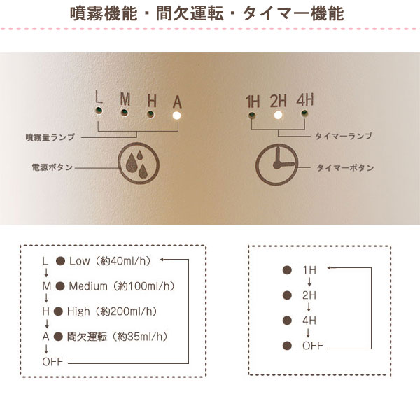 2.運転中、再度電源ボタンを押すとL(Low)→M(Medium)→H(High)の噴霧量変更、A(間欠運転)へ切り替えができます。